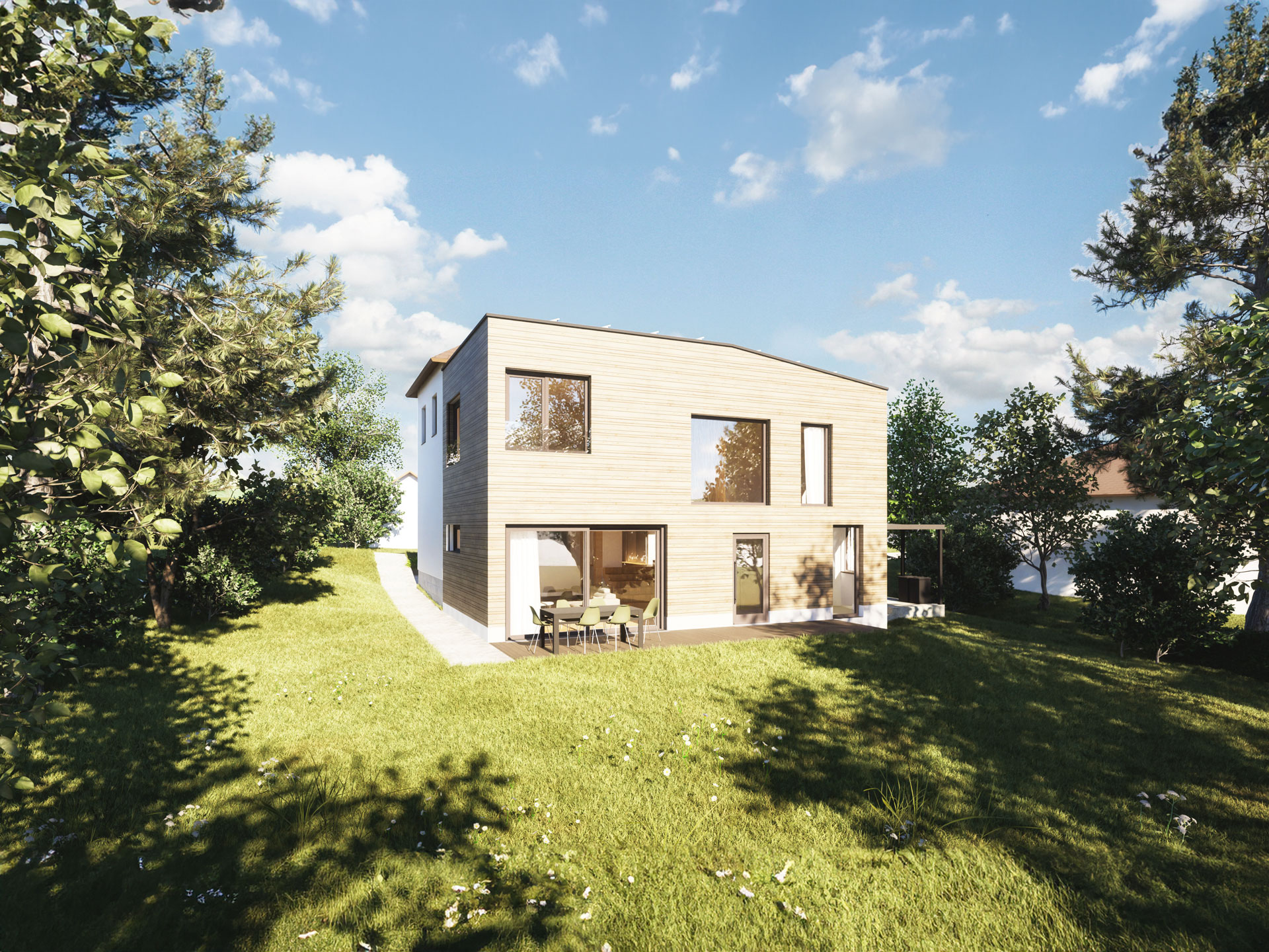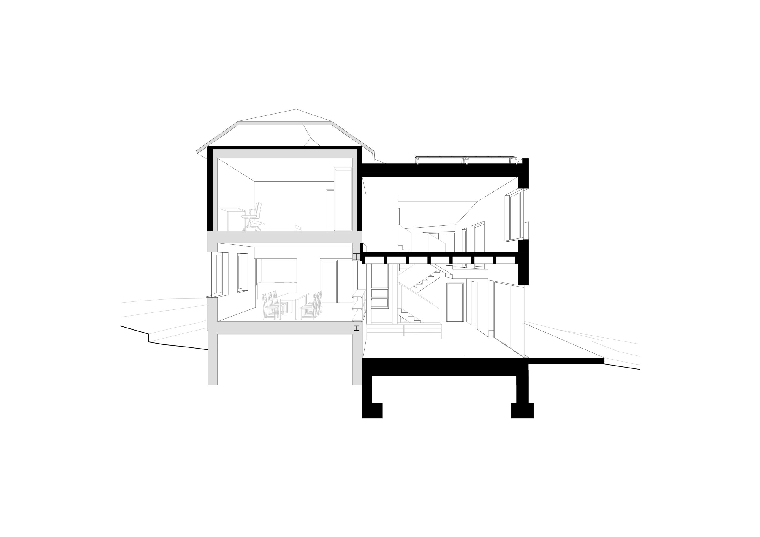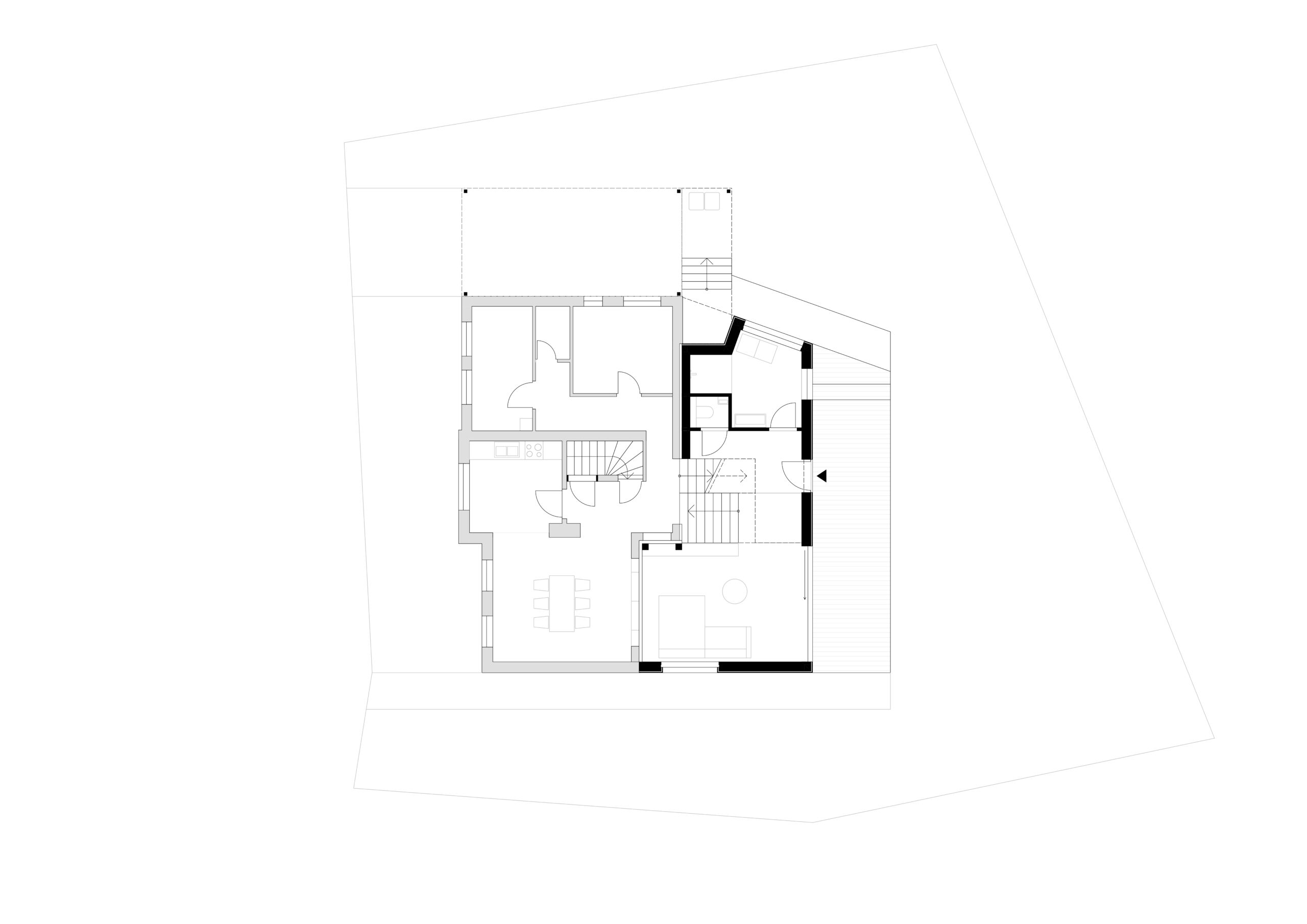 Der neue, zweigeschossige Baukörper erstreckt sich über die gesamte Breite des Bestandsgebäudes im Garten. Im Erdgeschoss befinden sich der neue Hauseingang und ein Teil des Wohnraums. Zum Bestand wurde durchgebrochen, um einen großzügigen Raum zu schaffen. Außerdem entsteht ein zusätzliches Badezimmer.